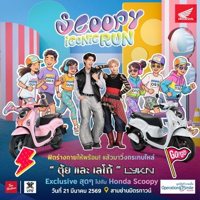 รถจักรยานยนต์ฮอนด้า ชวนแก๊งเจนใหม่และผู้รักการออกกำลังกายทุกคน มาร่วมสร้างสีสันยามเช้ากลางเมืองกับกิจกรรม “Scoopy iCONiC Run” งานวิ่งที่ผสานความสนุกของการเคลื่อนไหวเข้ากับแฟชั่น และพลังของคอมมูนิตี้คนรุ่นใหม่ในสไตล์ไอคอนิก พร้อมชวนทุกคนออกมาใช้ชีวิตให้แอ็กทีฟ พร้อมวิ่งกระทบไหล่ไปกับ ตุ้ย และเลโก้จากวง LYKN พรีเซนเตอร์ New Honda SCOOPY เตรียมพบกันในวันที่ 21 มีนาคม 2569 เวลา 06.30–09.00 น. ณ สามย่านมิตรทาวน์