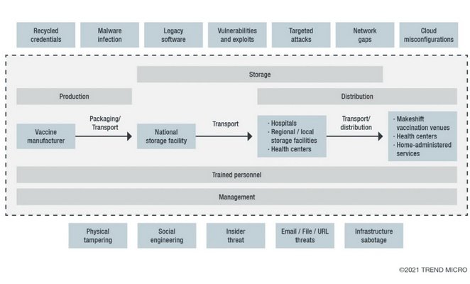 กลวิธี เป้าหมายและกิจวัตร จากข้อมูลการตรวจสอบพบว่ามีการนำเอาทั้งแนวทางกระบวนการทางสังคมทั้งเก่าและใหม่ ผสานกับแนวทางในการใช้มัลแวร์แบบใหม่ ไม่ว่าจะเป็นเรื่องของกิจวัตร รูปแบบการหลอกลวง และการโจมตีตามกระแสในการกระจายวัคซีนทั่วโลก พุ่งเป้าไปที่ ซัพพลายเชนด้านการขนส่งที่มีการควบคุมอุณหภูมิ (cold chain) Cold chain คือบริการด้านการขนส่งและการจัดการในการรักษาคุณภาพของวัคซีน ตั้งแต่กระบวนการผลิต จัดเก็บ ขนส่ง และการกระจายสินค้า โดยเฉพาะอย่างยิ่งในเรื่องบุคลากรที่ต้องได้รับการฝึกอบรมเฉพาะด้านในการจัดการ จัดเก็บ และขนส่งสินค้าเหล่านี้ โดยการตรวจสอบพบว่ามีกิจกรรมบางอย่าง เช่น การฟิชชิ่งที่มุ่งเป้าไปที่องค์กรธุรกิจหลักในอุตสาหกรรมดังกล่าวเป็นหลัก รวมถึงธุรกิจที่เกี่ยวข้องรวมถึงหน่วยงานภาครัฐที่ดำเนินการในเรื่องของวัคซีน
