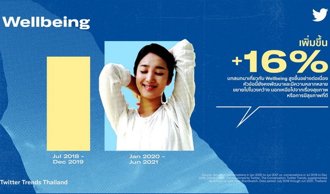 ชาวทวิตภพจะไม่ปล่อยให้ตัวเองอยู่ในสภาพเดิมๆ และ “ปล่อยชีวิตให้ผ่านไป” แบบง่ายๆ อีกต่อไปแล้ว บทสนทนาเกี่ยวกับ Wellbeing หรือ การมีชีวิตที่ดีเพิ่มขึ้น 16% แสดงให้เห็นว่าหัวข้อนี้แสดงถึงการที่คนไทยกำลังให้ความสำคัญในเรื่องของการเชื่อมต่อระหว่างสุขภาพกายและสุขภาพใจมากยิ่งขึ้น โดยเฉพาะเรื่องสุขภาพจิตที่เป็นเรื่องที่ชาวทวิตภพให้ความสำคัญมากขึ้น และได้มีการพูดถึงโดยทั่วไปอย่างกว้างขวางมากขึ้น