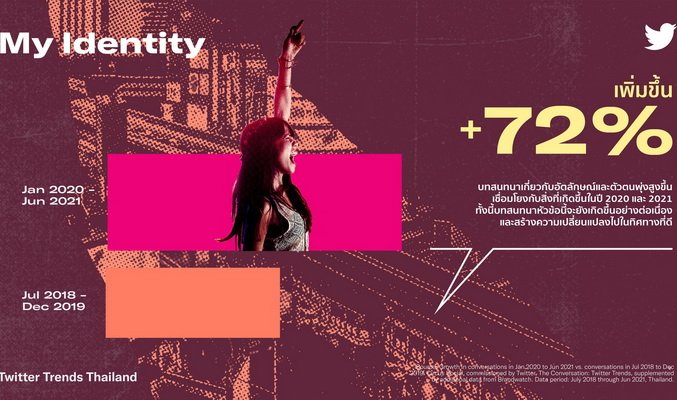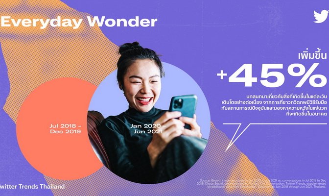 ประเทศไทยว่า พวกเขาคือใคร มีพฤติกรรมเปลี่ยนไปอย่างไร เทรนด์ที่กำลังมาแรงคืออะไร ซึ่งได้จัดทำเป็นรายงานข้อมูลเชิงลึกขึ้นชื่อว่า Thailand TwitterTrends Report 2021 โดยจากการศึกษาพบว่า มี 6 กลุ่มหัวข้อสนทนาที่กำลังเป็นที่นิยมและกำหนดทิศทางอนาคต คือ Wellbeing, Creator Culture, Everyday Wonder, One Planet, Tech Life และ My Identity ซึ่งเราทราบดีว่าแบรนด์ที่มีความเกี่ยวข้องกับวัฒนธรรมเหล่านี้สามารถแสดงศักยภาพของแบรนด์ออกมาได้เป็นอย่างดีและประสบความสำเร็จมากที่สุด ข้อมูลเชิงลึกเหล่านี้จึงมีประโยชน์กับนักการตลาดและแบรนด์ต่างๆ ที่กำลังมองหาวิธีเอ็นเกจและสร้างความเชื่อมโยงกับกลุ่มเป้าหมายของพวกเขาได้ดียิ่งขี้น