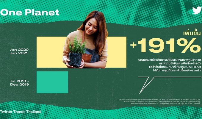 เทรนด์บทสนทนาที่มีการเติบโตรวดเร็วที่สุดบนทวิตเตอร์ประเทศไทย สูงถึง 191% เนื่องจากบทสนทนาที่เกี่ยวกับสิ่งแวดล้อมและความยั่งยืนกลายเป็นเรื่องที่อยู่ในกระแสหลัก คนไทยเริ่มใส่ใจ ขวนขวายหาข้อมูลเกี่ยวกับเรื่องเหล่านี้มากขึ้น เช่น เรื่องภาวะโลกร้อน และความปลอดภัยของสิ่งมีชีวิตในมหาสมุทร