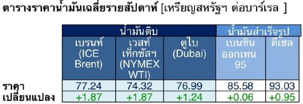 สถานการณ์ตลาดน้ำมันประจำสัปดาห์วันที่ 6 – 10 ม.ค. 68 และแนวโน้มสัปดาห์วันที่ 13 – 17 ม.ค. 68 โดยตลาดน้ำมันสำเร็จรูปเบรนท์ (ICE Brent) ราคา 77.24 เหรียญสหรัฐฯ ต่อ บาร์เรล ปรับเพิ่มขึ้น +1.87 ตลาดน้ำมันสำเร็จรูปของ เวสท์เท็กซัสฯ (NYMEX WTI) ราคา 74.32 เหรียญสหรัฐฯ ต่อ บาร์เรล ปรับเพิ่มขึ้น +1.87เหรียฐสหรัฐฯ ตลาดน้ำมันสำเร็จรูปดูไบ (Dubai) ราคา 76.99 เหรียญสหรัฐฯ ต่อ บาร์เรล ปรับราคาเพิ่มขึ้น +1.24 ขณะที่ราคาน้ำมันสำเร็จรูปซื้อซื้อขายล่วงหน้าที่สิงคโปร์ ราคาเบนซินออกเทน 95 ปรับราคาเพิ่มขึ้น +0.06 เหรียญ สหรัฐฯ มาเป็นราคา 85.58เหรียญ สหรัฐฯ ราคาน้ำมันดีเซลราคาปรับราคาเพิ่มชึ้น +0.95เหรียญ สหรัฐฯ มาเป็นราคา 92.08 เหรียญสหรัฐฯ